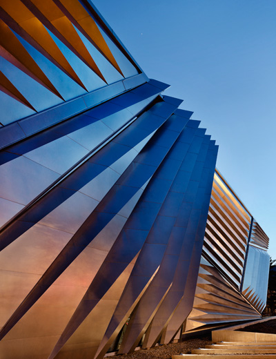 the project sits like a ring placed over the terrain, with its funnel-like roof forming a shaded perimeter walkway and an introverted core.
