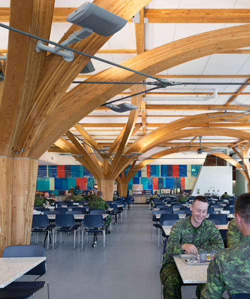ZAS architects’ canadian military dining hall features tree-like columns made of glu-lam