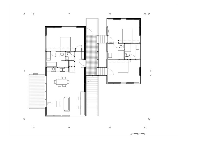 ZITA divides its house in páramo, colombia into two modules connected by a suspended sunroom. the main module holds the master bedroom and bathroom, and all communal areas. the second module contains two rooms and two bathrooms. by fragmenting the program the scale of the house is broken up and reduced, and the two modules end up having larger facade surfaces allowing for multiple and varied views and transparencies. the communal spaces face the predominant north mooreland view and have a steel closing which can be actioned using a hand-operated chain hoist to transform it into a terrace allowing the interior to extend outwards.