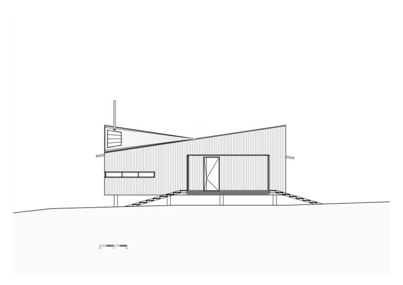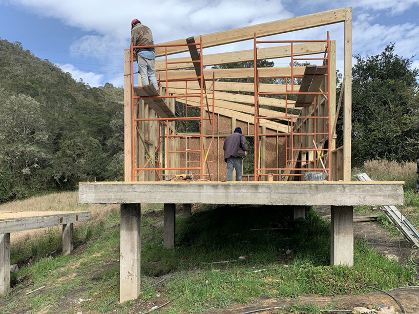 atop these pillars, a series of prefabricated timber porticos are installed and tied together by means of a system of prefabricated OSB walls and roof which operate as a structural diaphragm making the house’s skin part of its structure. by prefabricating the house, both construction time and waste were reduced. the assemblage of the house was performed 100% by hand and therefore avoiding the need for heavy machinery.