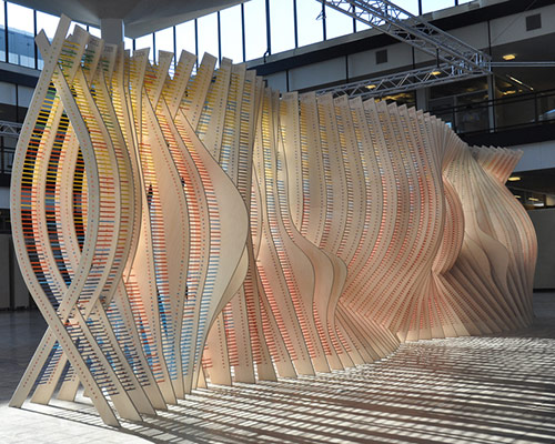 ‘centennial chromagraph’ is a life-size, tactile infographic representing the history of the university of minnesota school of architecture made from 8,080 colored pencils. design and research studio variable projects used computational tools to generate a physical construction of collected data from the over the 100-year history. the installation’s 100 robotically-routed plywood ribs are joined together by a chromatic array of #2 pencils.