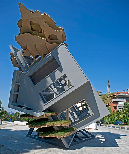 ‘cloudy thoughts’ by polish artist adam kalinowski utilizes wood, grass, and plants to create a poetic form concerning the passing of time and changing of cultural traditions. produced as one of three projects for the beşiktaş international flower & garden festival in istanbul, the sculptural building features formations of clouds and rocks on all sides, expanding into space. ‘cloudy thoughts’ measures 560x68x500cm.