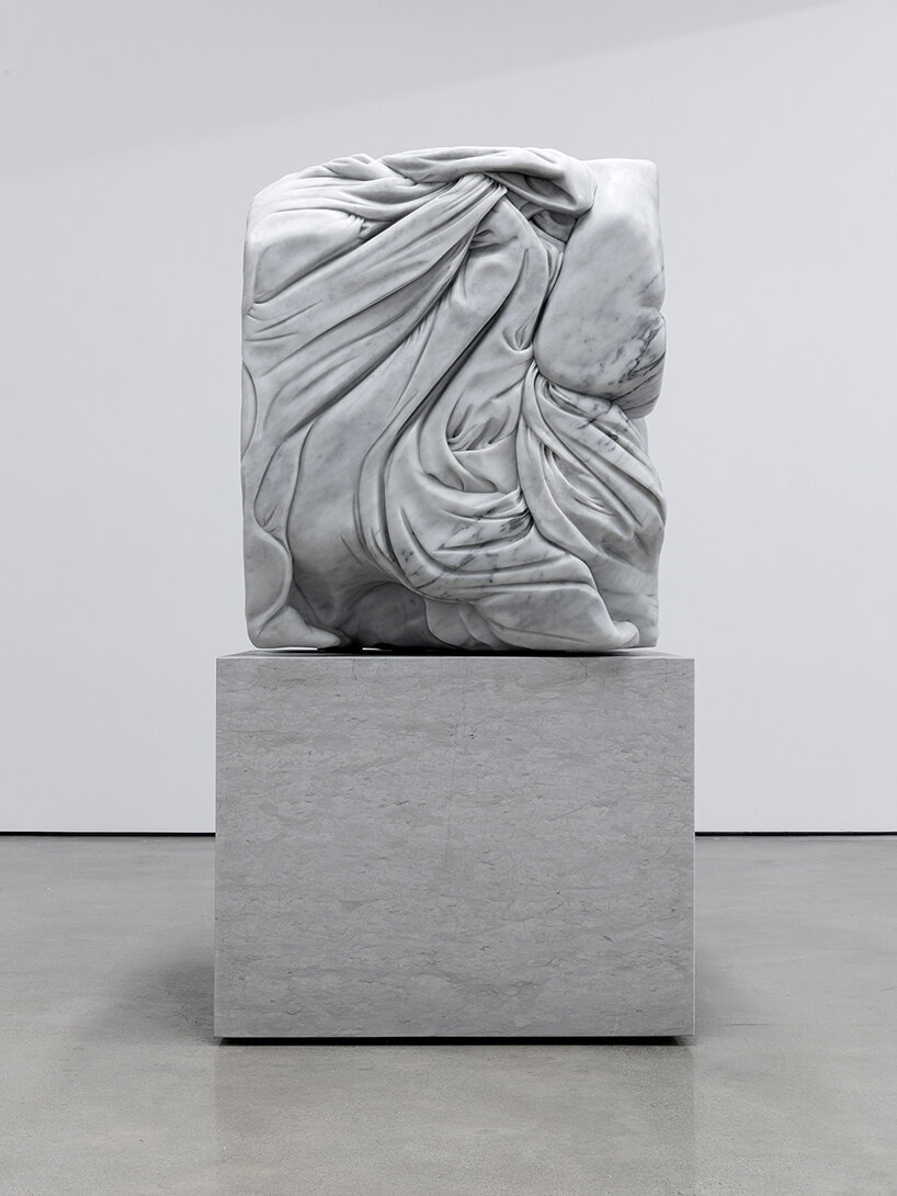 The Hole L.A. presents six new sculptures by Adam Parker Smith in the form of Crush, the artist’s fifth solo exhibition with the gallery. While furthering Smith’s stylistic sense of humor and long-standing investigation into the legitimacy of classical forms, this show represents a monumental departure for the artist in terms of both material and scale. Occupying one cubic meter each, Smith’s new Carrara marble sculptures are at first glance both instinctively recognizable and bizarrely uncanny, as though the canon of classical statuary has been run through a trash compactor.