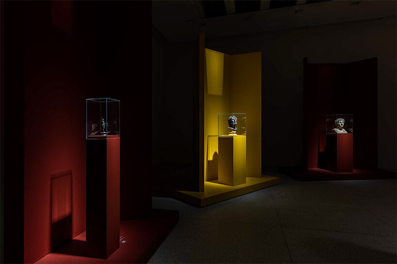 Aldo Cibic and Joseph Dejardin (find more here) designed the exhibition to not only tell a broader story about the beauty of Roman life and culture, but also to highlight the individual experience of each piece as an object of beauty in its own right. Dramatically lit exhibits in darkened rooms with bold colors create a compelling emotional experience. At the same time, a series of enclosures divide the spaces and create a labyrinth through which the experience slowly unfolds. These enclosures allow for both an intimate experience of the exhibits and the use of openings to provide views of spaces and objects. Throughout the display, key quotes are highlighted to emphasize core concepts, encouraging thoughtful engagement with the exhibits.