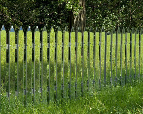 the subtle reflection of space and its ever changing qualities is expressed in the work of alyson shotz. the american artist conceives large-scale sculptural pieces which stand as mediums in which one experiences their surrounding environment with a renewed perspective. ‘mirror fence‘ is indicative of shotz’s creative approach whereby she has constructed a picket fence entirely from mirror. the iteration illustrated in this feature was a commissioned installation for storm king art center in new york, and exhibits the physical existence of the barrier being almost completely obliterated by its glassy surface that casts back images of the landscape in which it stands.