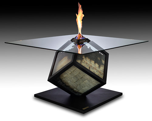 ‘too much?’ by atelier amarist and alejandro monge is an example of when contemporary art and design become one. the sculptural dining table, consists of a glass cube containing partially burnt notes with a thin biofuel flame rising above its surface. each intricate detail was taken into consideration as the artist meticulously reproduced the bills by gluing and coloring each individual piece of paper. yet, according to the artist, ‘the most complicated part of the process was to simulate the effect of burnt paper eaten by flames never using fire to achieve it.’ this required the use of a hyper-realistic technique which simulated the effect of a burning fire morphing and petrifying ashes with resin. consequently, the furnishing is meant to provoke deep thoughts within the mind of the viewer about the significance and value of money, time, and people. ‘a note is a dyed piece of paper that represents a number, 10, 20, 50 dollars, yens, euros. a figure that we exchange in order to acquire something wanted. a figure that within itself has no more value than the one given to the job or the time traded,’ said monge.