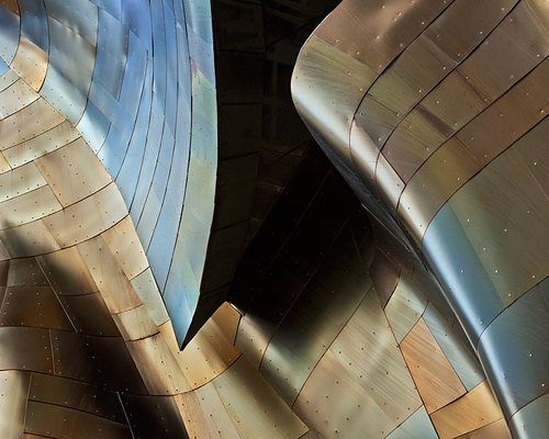 when new york city-based photographer andrew prokos looks at frank gehry’s architecture he sees the singular parts as well as the whole. he recently deconstructed the canadian architect’s EMP museum in seattle  (also known as the experience music project and science fiction museum and hall of fame) through a series of fine art photographs entitled ‘gehry’s children’. the images allow the onlooker to access the structural framework of the towering, sheet-metal construction in a new way by focusing on its elemental shapes and raw textures. both undulating curves and acute corners span the façade, and a fusion of surface colors — including gold, blue, red, and silver — compose the exterior scheme. ‘I have always been fascinated by the materiality of gehry’s buildings,’ says prokos. ‘he is not only a master at playing with forms, but he also gives us an array of textures and color — from titanium and polished steel to iridescent glass. with this series I really wanted to convey a new way of looking at gehry’s work.’