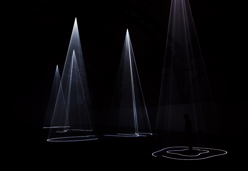 the luminescent figures slowly turn, only observed when viewers watch the end point of the projection