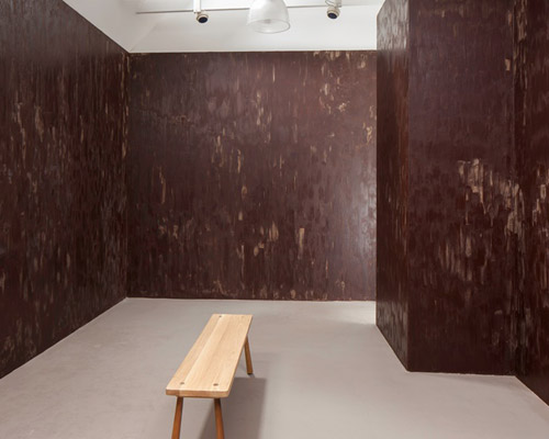 scottish artist anya gallaccio assaults the senses of visitors to edinburgh’s jupiter artland with ‘stroke’, an entire room covered in thick dark chocolate. the immersive and interactive installation is lightly scented, beckoning gallery visitors to interact with the walls, by picking, licking or stroking the edible surfaces. activated by the audience, the exhibit is just as much about the edible space itself as the desire and anticipation of entering the room, suggesting gallaccio’s recurrent themes of lust and feminism.