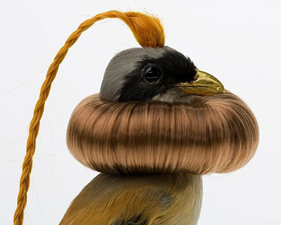using mixed materials like plumage, hair, gold, and paint, new zealand artist karley feaver creates exotic creatures and nests with a strangely familiar and surreal aesthetic. transforming found birds — all of which are ethically sourced and have died of natural causes — from stagnant figures to sculptural objects, the reconfigured animals are fitted with extravagant hairdos. ponytails, mohawks, dreadlocks, and braids are styled onto the colorful fowl, some with shining gold-painted beaks, granting each a personality, identity, and singular charm. habitats fashioned from both human and synthetic hair weave new interpretations of traditional nestings, modeling a novel type of avian architecture. ‘I am interested in the scientific, intellectual and aesthetic reasons behind the re-creation of the animal,’ feaver explains. ‘I am exploring how each one could exist in a domestic setting by adapting to their surroundings.’