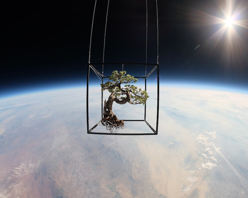 tokyo-based artist azuma makoto in collaboration with john powell of JP aerospace have completed a botanical space flight, sending a japanese white pine bonsai suspended from a carbon-fiber frame, and an arrangement of orchids, hydrangeas, lilies and irises, among other plants into the stratosphere. launched with a specially equipped balloon from black rock desert in nevada, the mission, entitled ‘exbiotanica’, was conceptualized to let different plants step into the unknown, away from earth.