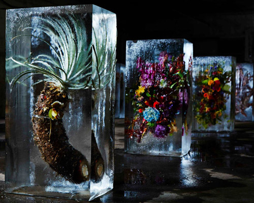 the ‘iced flowers’ exhibition created by tokyo-based florist artist, azuma makoto, observes the changing life of flowers that have been placed in frozen water. the assortments of plants display unique expressions that are not visible in everyday activity, but are when placed under different environments such as this extreme case. the clear, almost crystal-like prisons make a vivid contrast with the beautiful, suspended objects inside. as the ice begins to melt, the blossoms start to change shape and the disparity is heightened as a glowing effect is added. this ever-evolving art spectacle furthers azuma’s already extensive portfolio of flower-influenced work, which the recent ‘exobiotanica‘ project where plants were dangled up in space, is one such example.