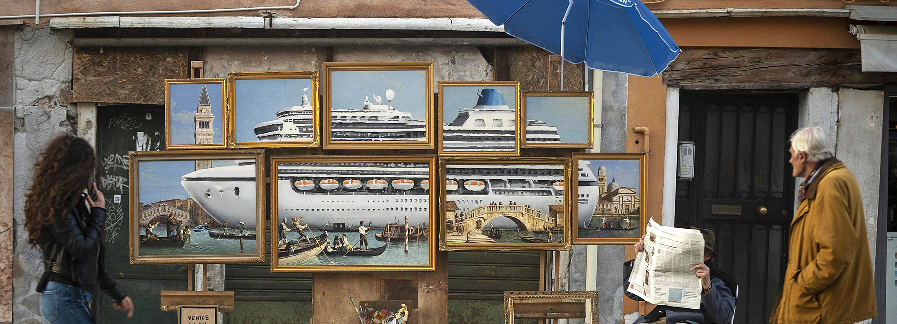 ‘setting out my stall at the venice biennale,’ the anonymous artist writes. ‘despite being the largest and most prestigious art event in the world, for some reason I’ve never been invited.’ a minute-long video documents a concealed man setting up a tableau of framed oil paintings on the streets of the italian city. when assembled, the group of images depicts the ever-controversial cruise ships that dwarf venice’s spectacular cityscape as they make their way past the grand canal.