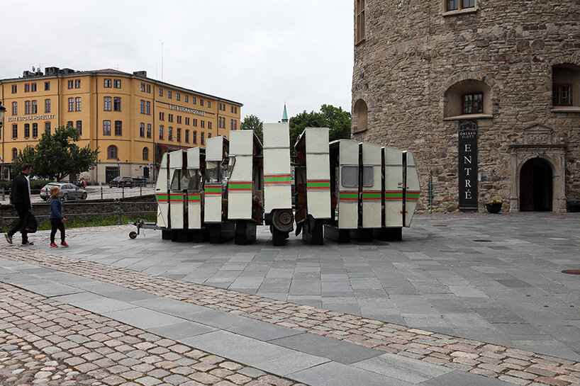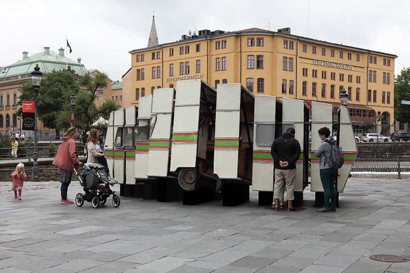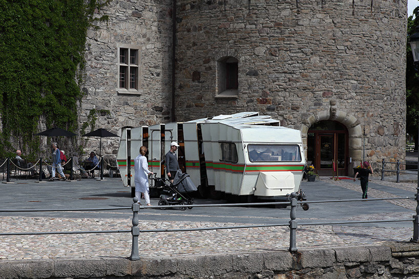On the occasion of the OpenART art biennial in Örebro, Sweden, artist Baptiste Debombourg realized a thought-provoking public artwork in the form of a cut-open caravan. In reference to the COVID -19 crisis, the work distorts the perception of space and home, calling attention to how the pandemic restricted people’s movement and took away their freedom. Despite this, through its enigmatic form, the piece titled ‘Amplifier’ oscillates between demolition and transformation, preserving a glimmer of hope among the overall sense of destruction.