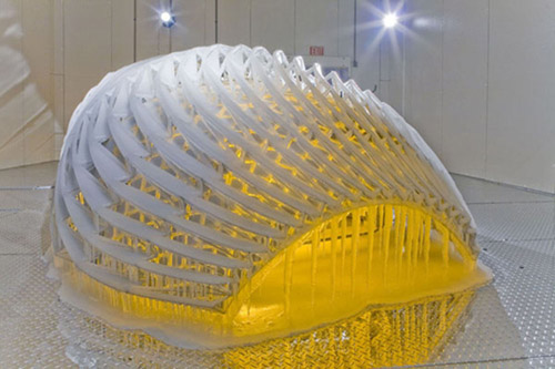the hydrogen powered car is designed to quash the concept that eco-friendly cars can’t be fast. eliasson’s car features a 2 layer skin made of reflective metal, covered with fragile layers of ice in a bid to reflect the themes of mobility, renewable energies and the relationship between car production and global warming in an artistic manner.