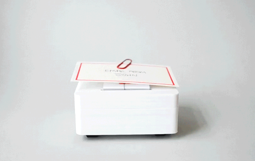 notifications from digital devices are often like the glass form they sit behind – hard, cold and unforgiving. paper on the other hand is exactly the opposite – soft, warm and tactile to the touch. ‘sarah’ lets you create a notification that alerts you, but in a gentle, silent unobtrusive manner. this digital connected object frees the paper from behind the glass and uses the warm subtle qualities of the analog world to create ambient notifications that inform in a more human, charming manner.