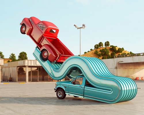 pickup trucks seem to be stretched, twisted and turned in UK-based artist chris labrooy’s ‘tales of auto elasticity’ series, which depicts vibrantly colored cars in strangely distorted situations. the manipulations introduce utilitarian vehicles into the digital realm, warped into elastic compositions and set within abandoned parking lots. interlocking fords and neon-clad cruisers launch off of each other, fold over themselves and corkscrew in the air, forming a oddly proportioned universe of unrecognizable vehicles.