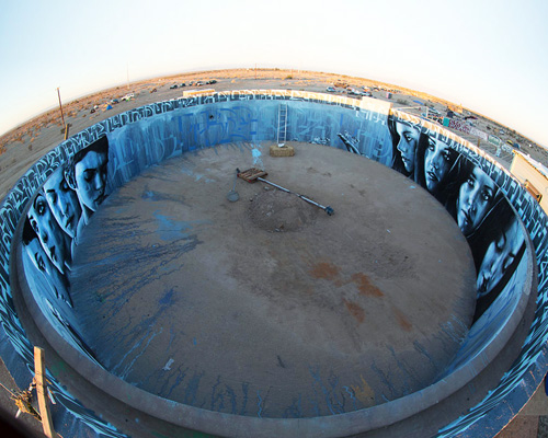 in the desert of slab city, california, artists christina angelina and ease one have completed ‘kinetoscope’, a circular mural inside an abandoned water tank. in order for visitors to access the site, they must climb a staircase to the top of the tank, where a ladder takes them deep into the bottom of the structure.