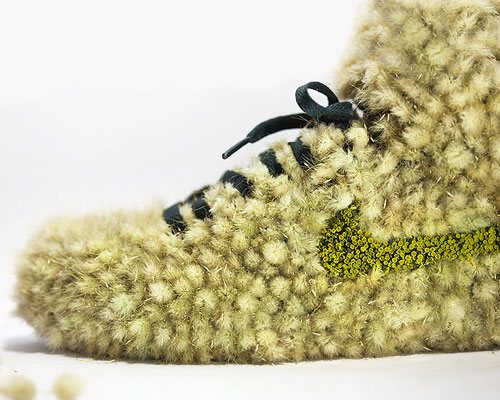 parisian artist christophe guinet rethinks the iconic NIKE slogan with his project ‘just grow it’ by cultivating sneaker-shaped vegetable and plant-based sculptures. the sneakers, signifying cult products of urban youth, are transformed into compositions made from rocks, poppies, seeds, flower petals and wood. assembled with patience and with remarkable dexterity, the plant shoes are rendered in a hyper-realistic state, with every facet of the sneaker from the sole to the swoosh pieced together with the environmental materials. the project asks the viewer to rediscover the beauty in nature, not just in manufacturing.