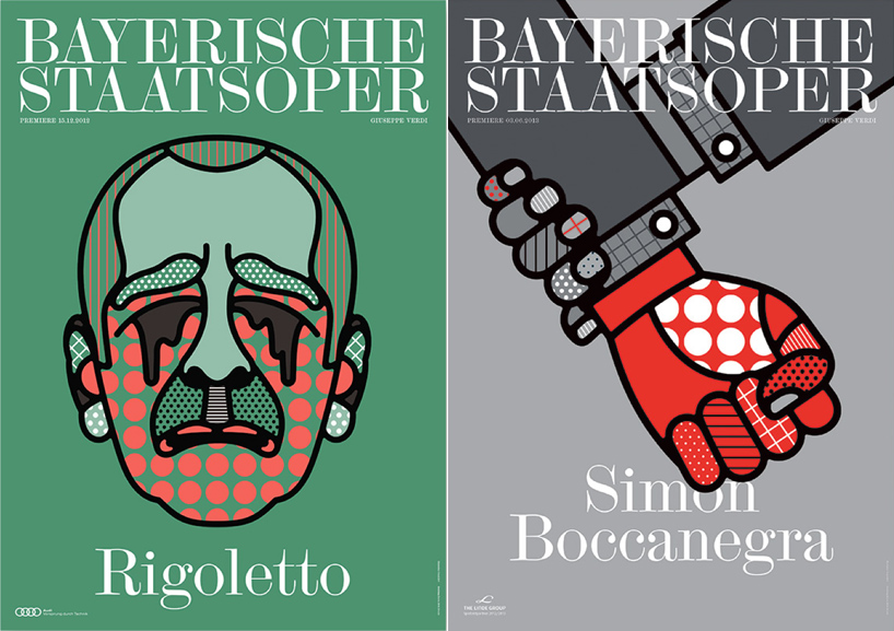 their latest artwork goes across both the opera and concert programmes of the bavarian state opera, an institution founded in 1653 under the instruction of princess henriette adelaide of savoy. the munich-based opera company has premièred the work of some of the genre’s greatest composers, notably wagner and mozart, and is still considered one of the best in the world.the poster series is announcing the forthcoming 2012-13 season of the staatsoper: a series of orchestral concerts and the opera premieres.craig and karl opted for a clear delineation between the two. for the concert versions they’ve used a bolder, more expansive palette whilst for the operas a more limited palette of only two or three colours. obviously in relation to the theme and appropriate to the mood of each.