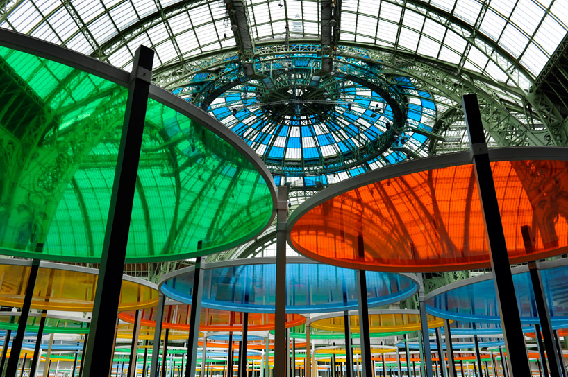 a view of both the colorful shadows cast by the installation and the bright circular roof components