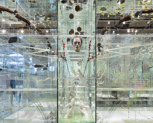 for his fourth solo exhibition at andrea rosen gallery, new york, canadian artist david altmejd hypnotizes visitors with large-scale monumental installations stretching across three exhibition spaces. each distinct environment crafted within the room shifts perceptions of matter and time, surface and structure, inside and outside. at the show’s core is ‘the flux and the puddle’ a towering transparent mass, remarkably as fragile as it is weighty; an intricately layered slice of another world that fills the gallery’s first room. seemingly infinite layers of matter are contained within the translucent, reflective and stacked structure, housing various information and media used throughout the artist’s oveure such as werewolves, plaster figures, bird men, heads, smashed mirrored panels, and explosions of resin fruit. altmejd overlaps the figures and frozen compositions into a web of intertwining arrangements, animating the floating forms with a complexity and depth that demands a physical experience from the viewer.