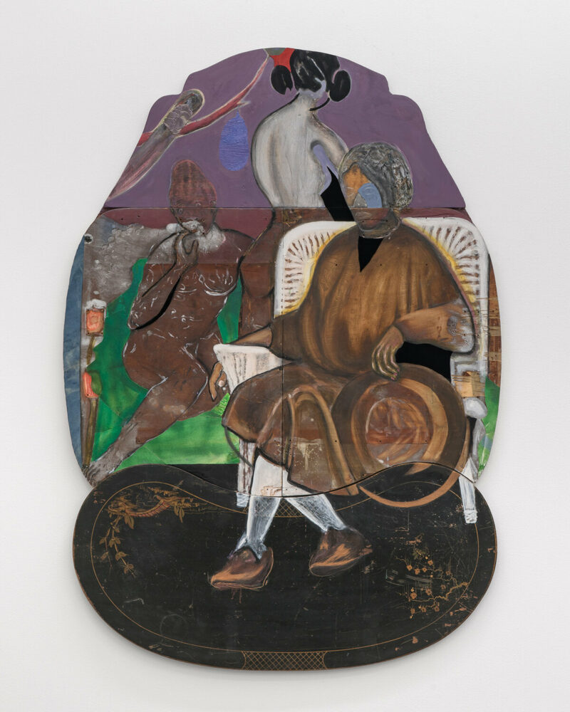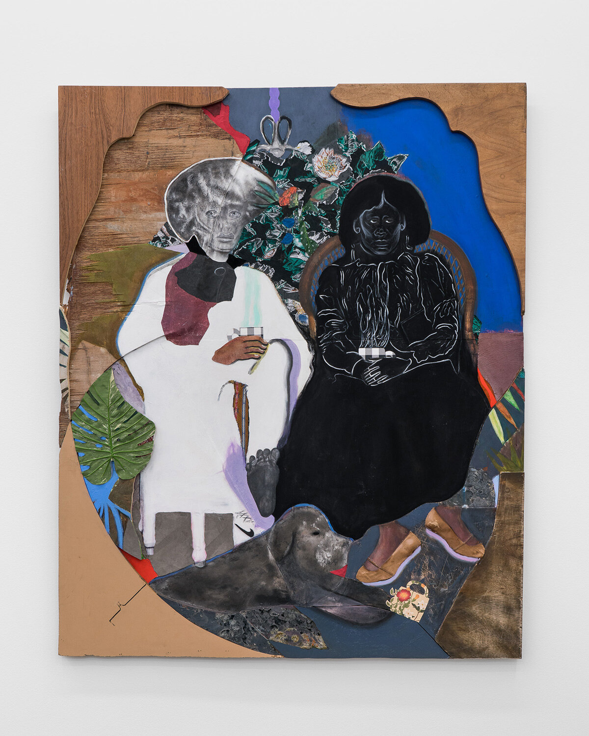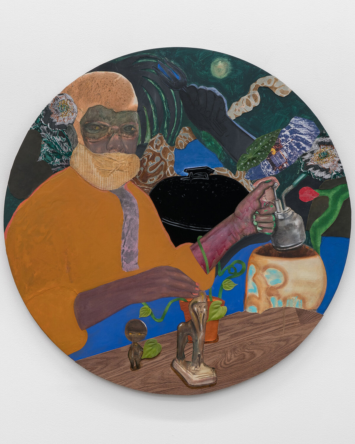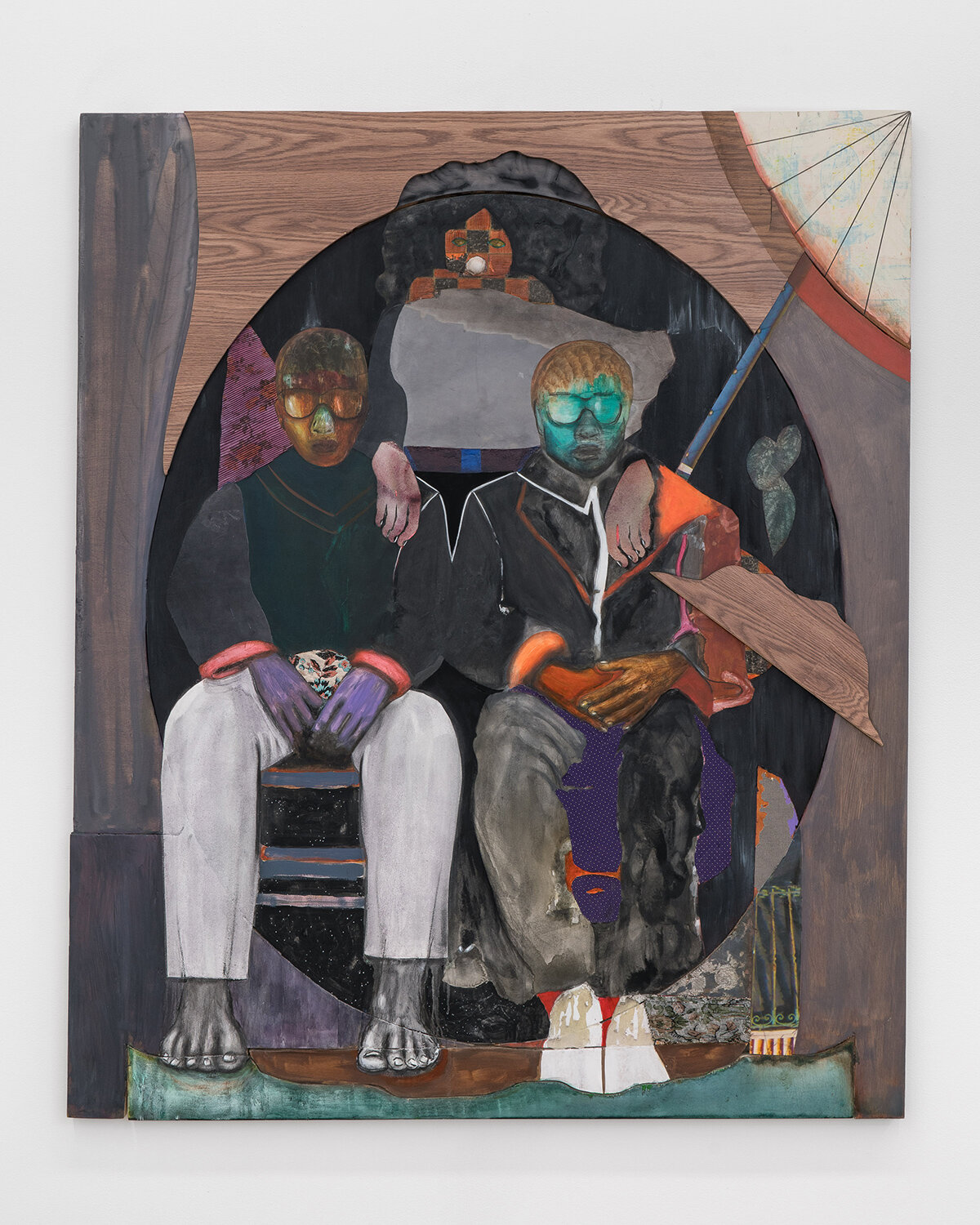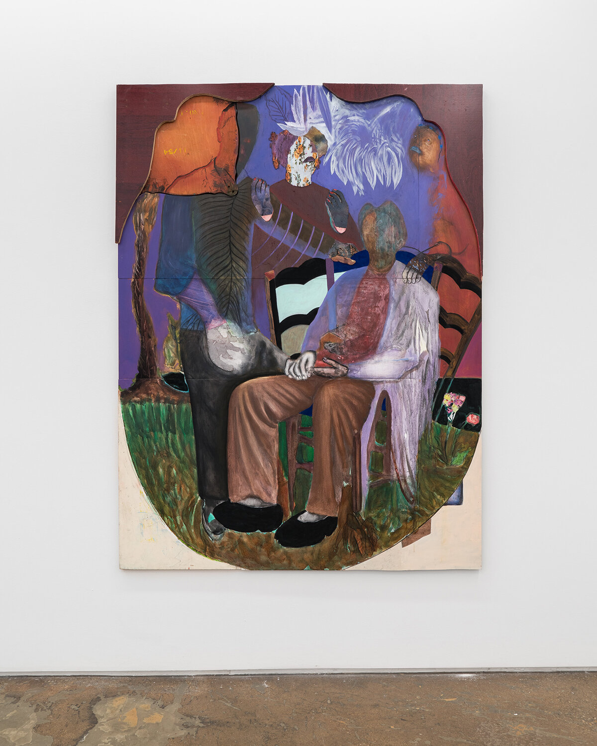 DS: Natural Sovereignty is about the vitality of family life and communing with nature. The backyard and garden are extensions of the home, so it made sense for me to use domestic items such as flooring, doors, and tabletops to create assemblages that allude to both the interior layers of the home and to their exterior spaces. These different items become collage elements with their own histories and stories to tell. They extend the narrative of the work and push the physicality of the painting surface. I assemble the construction first and then collage layers to build the exterior and interior space where the narrative emerges from, and the gesture of figures creates a familial bond. These characters exist in otherworldly realities, where they govern over themselves and have total autonomy.