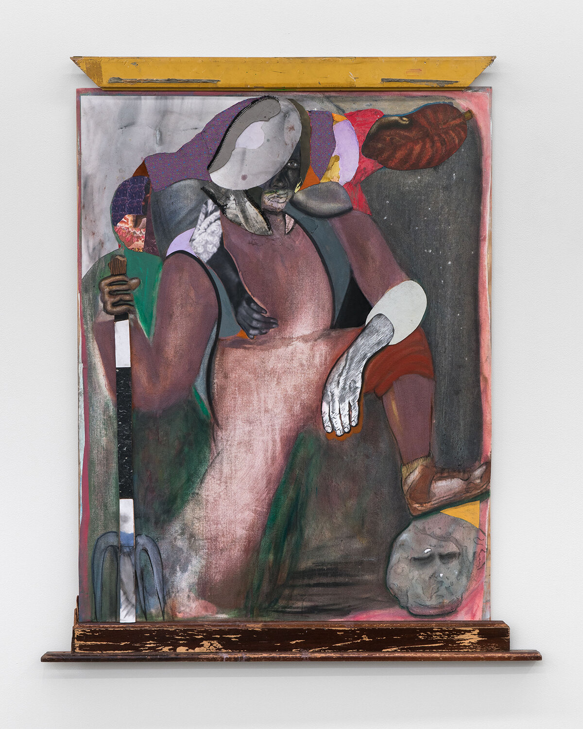 Natural Sovereignty is set against the backdrop of David Shrobe‘s soon-to-be-vacated Harlem studio, and is displayed at moniquemeloche‘s Chicago gallery. It is a culmination of David Shrobe’s lifelong engagement with his surroundings. Through a careful process of collecting found objects from his neighborhood, he breathes new life into disused materials — tabletops, doors, molding, mirror frames, wood flooring, and textiles — by infusing them with layers of meaning and memory. Shrobe further emphasizes the backyard and garden as an extension of the home. These natural community spaces are described as being imbued with sustenance, survival, and resistance. Turn-of-the-century photographs of Black and Indigenous Americans are reinterpreted through a contemporary twist on the classical portrait. This way, David Shrobe’s work represents a declaration of autonomy and empowerment for people of color.