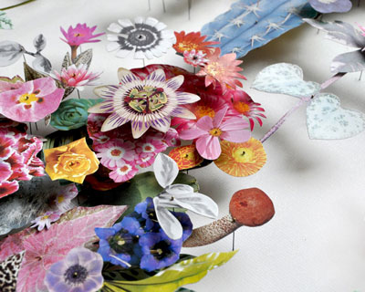 netherlands-based artist anne ten donkelaar constructs her intricate flowerscapes using both real pressed flowers that she collects collaged with paper floral elements. the series of three-dimensional collages display intertwined branches climbing towards the top of the canvas, decorated with vibrant pink peonies, blue cacti, and tiny yellow roses. each overlapping element is delicately fixed to the canvas with tiny pins, creating dynamic depth and levels of montaged vegetation.