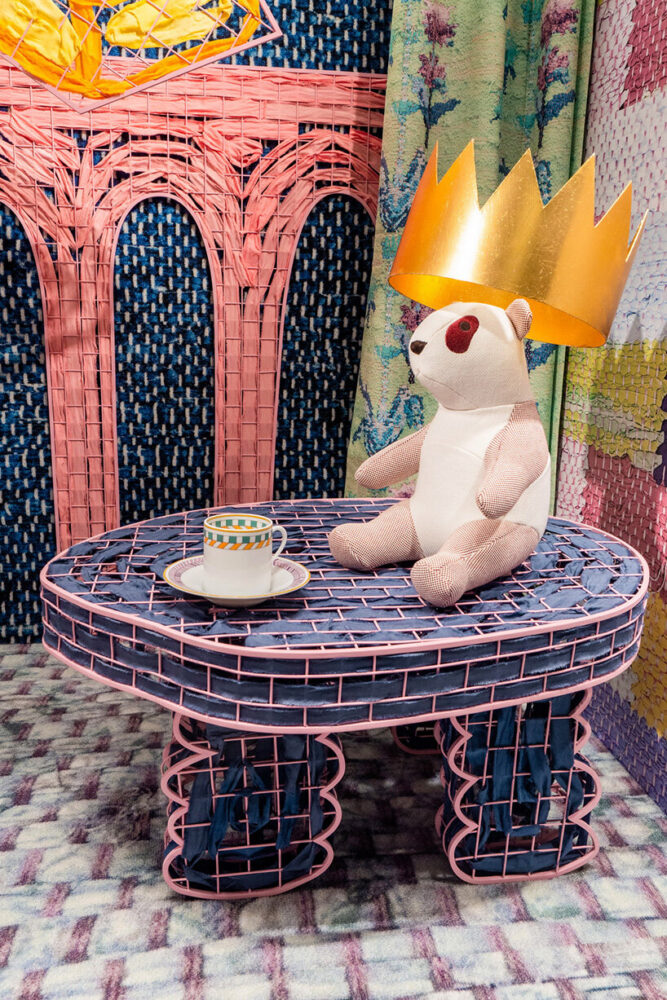 Across her wider practice, Dénéréaz pushes weaving toward spatial and architectural forms. Lirette becomes facade, doorway, altar, or shrine, often mounted on metal grids or wooden frames. ‘The idea of textile architecture fascinates me,’ she says. Soft surface is the body’s first habitat, and I enjoy revealing how tapestries, traditionally reserved for interiors, can become walls in their own right.’ These structures form what she describes as an ‘imaginary village’, a network of passages and refuges where personal memory intersects with collective myth.