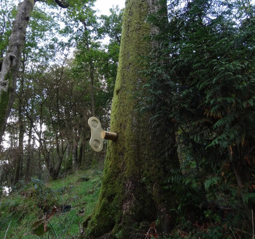two men work to secure the cog to the tree, creating the ‘clockwork forest’