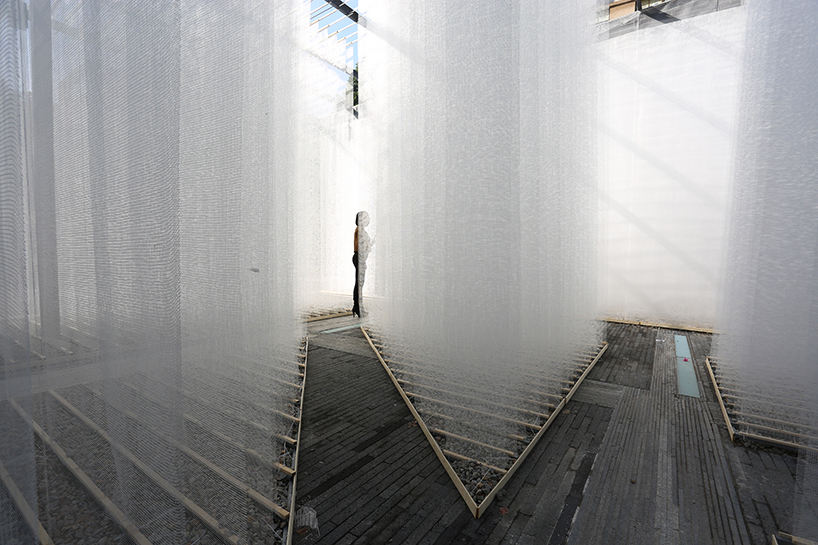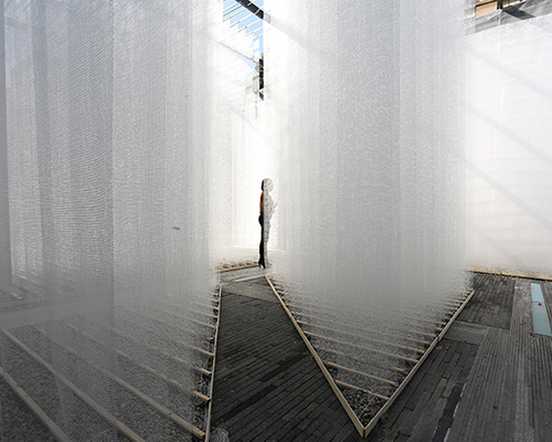 within the dense, modern metropolis of shenzhen, local architecture practice deve build have installed an artistic space to retreat from the hectic hurry of everyday life. ‘the fading past’, first published by designboom china, has been realized within a residential courtyard area, offering a place for visitors and passersby to naturally meander through. long sheets of fiberglass netting are suspended on tall metal frames, forming a labyrinth of corridors and paths to wander between. appearing like a dense fog, one that often hovers above chinese cityscapes, the installation immerses pedestrians in a maze of woven mesh material that both reveals and conceals the surrounding landscape. the sheets of semi-opaque material are orgznied to create an effect that uncovers small traditional objects placed within random apertures, reminding viewers of the sometimes overlooked simplicities of daily life.