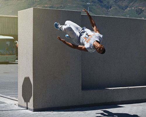 for the skill and risk required in parkour — a movement discipline where athletes propel themselves from place to to place using high speed and momentum — professionals require an incredible understanding of discipline, control and knowledge of themselves. these characteristics motivated photographer dimitri daniloff to capture a series of images which freeze extraordinary moments from the ultra intense sport in time. with kundai kenji murapa, brand ambassador for new balance south africa and director of sabotage elite parkour, as the subject, daniloff seizes a split second into a single frame — extreme altitude jumps off towering structures, whirling flips from storey-high staircases and mid-flight flings across adjacent concrete beams. ‘the idea I like behind parkour is that it’s not about going beyond your limit and taking a risk’ daniloff describes, ‘it’s more about knowing exactly what you’re able to do’.