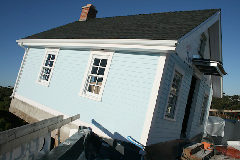 placing the home at the edge of the UCSD jacobs school of engineering building 1, tilted at a 10 degree angle