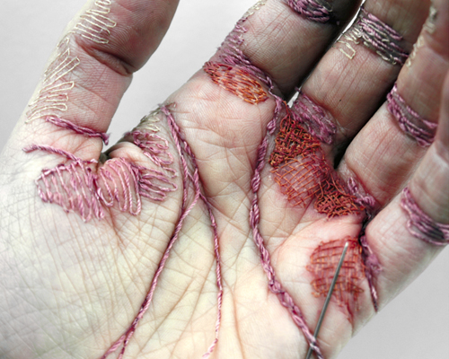 using her own skin as a canvas, british artist eliza bennett has realized a self-inflicted sculpture, woven into the palm of her hand. considering the flesh as a base material, bennett carefully stitches patterns and lines into the epidermis of her body using colored thread; ‘a woman’s work is never done’ results as an incredibly worn-looking hand, overworked and fatigued. by using intricate embroidery techniques — traditionally used to symbolize femininity — and applying it to a context of its opposite, bennett challenges the pre-conceived notion that ‘women’s work’ is light and easy. ‘through a personally charged perception, I explore a range of issues relating to the formlessness of both individual and social reality’, the artist says of her ephemeral sculpture’s significance. the administered piece on the surface of her skin aims to chronicle the effects of labor intensive work, while drawing attention to low paid jobs such as cleaning, caring, and catering, all of which are traditionally considered to be gender specific towards women.