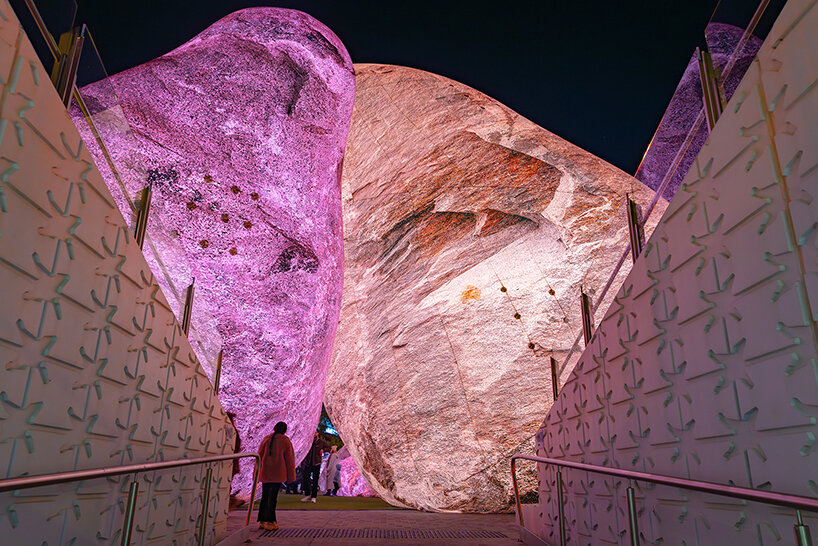The installation by ENESS comprises sixteen air-filled inflatables textured with photographic prints of granite, creating the optical illusion of massive rock formations. Visitors can walk among these oversized forms and explore crevices and narrow passages up to 10 meters long, simulating the experience of traversing a canyon. As daylight fades, Iwagumi Air Scape by the Melbourne-based practice shifts through a vibrant lighting display paired with an interactive soundscape. Sounds of native birds, frogs, crickets, monkeys, bats, and mountain streams are triggered randomly as visitors move through the space, heightening the immersive quality of the installation. Ambient urban noises subtly intrude within the formation, underscoring the dialogue between natural and urban environments.