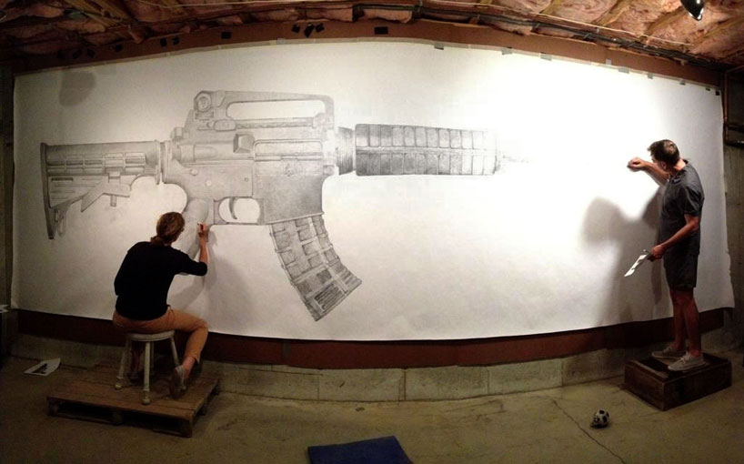responding to recent tragedies in the united states that resulted from gun violence, american artist greg bokor is using his creative talents to make a statement and encourage conversation about a disturbing social issue. ‘erase’ is an interactive art piece, an entry for artprize 2013, that will have viewers physically erase a 6m x 2.5m drawing of an AR-15 assault rifle. the highly detailed illustration is done entirely in graphite pencil, and currently at 80% completed, has taken bokor approximately 300 hours to render. the large-scale piece will be installed adjacent to an enormous stack of erasers, each bearing the name and age of a young victim of gun violence.