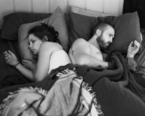 saddened by the experience that was burned into his mind, pickersgill chose to document these everyday moments through photography. ‘removed’ shows couples, families, siblings and individuals looking at what would be a smartphone, but the technology has been taken away. pickersgill asked each subject to hold their stare and posture as he removed the device from their grip, then made each exposure. the resulting images exaggerate the effect — a mother and daughter blankly stare down at missing screens; a couple in bed face in opposite directions, each coddling their removed devices; a newly married couple look down with vacant expressions, rather than each other.