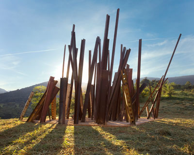 a construction crane drops 100 locally sourced steel I-beams from a height of 45 meters into a 3 meter-deep wet concrete pit for chris burden’s ‘beam drop’ — an immersive, site-specific installation at inhotim, a contemporary art center and botanical garden in brazil. the random fall of the metal creates an abstract arrangement that results from both the artist’s control and by chance. the violent clangs that resonate from the metallic blows juxtapose the vast, serene natural environment of the massive art complex. in its aftermath, ‘beam drop’ displays severe, vertical pieces of hardware protruding from the earth, translating into a sculptural art piece that envelopes the viewer in the rigid framework of its medium.