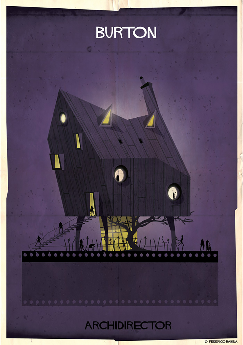 federico babina draws a comparison between the makers of architecture and the creators of film in his latest series of illustrations titled ‘archidirector’. ‘directors are like the architects of cinema.’ babina says. ‘they are those that build stories that like buildings envelop the viewer and carry it in a different world. each with their own style, language and aesthetics, think, plan design and build places and stories that host us for the duration of the movie.’