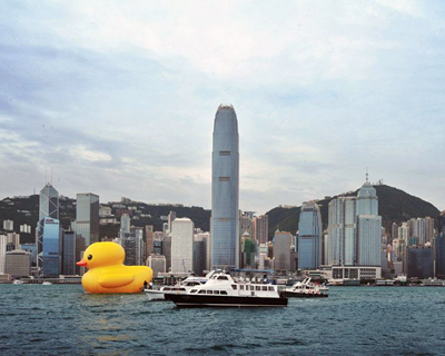 view of the rubber duck from a far, floating alongside the vessels coming into the harbour