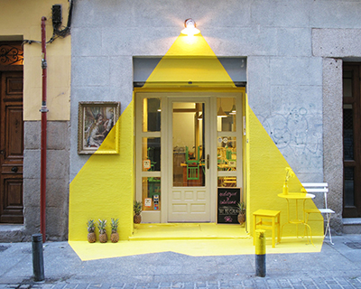 (fos), a multidisciplinary team of interior designers and art directors based in madrid and barcelona, created an ephemeral installation that gives a visual perception of a projected beam of light. the installation is named (fos), the name as the team itself, appropriately translating to ‘melted’ in catalan and ‘light’ in greek. the protected façade of the rayen restaurant in ‘barrio de las letras – madrid, has been illuminated for 4 days and nights. in this project the intention was to give the illusion of an artificial light shining from above made by using over 250 meters of yellow tape, pineapples, painted pieces of art, lawn furniture and … a lamp, creating a visual spectacle between perspective and colored volumes. the tape covered both vertical and horizontal surfaces creating a skin which followed the beam’s shape, covering all the objects in its path so that a spectator standing directly in front of the installation will see the visual illusion line up perfectly over the several planes that make up the scene – a vibrant game of perspective that will catch the eye of any passerby on the grey street,