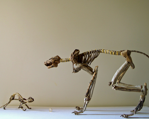 skeletons of birds, dogs, bats and snakes are constructed from the wooden scraps by following a specific study of the animal’s original structure. cleaning the pieces from sand and selecting the most suitable fragments to fit the sections, a level of anatomic accuracy is achieved.