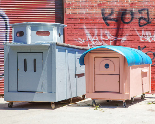 the necessity to shelter the homeless is a prevalent and widespread reality for many urban areas, including oakland, california, the hometown of american artist gregory kloehn who is using his creative capacity as an action for change. as the founder of the ‘homeless homes project‘ — a community driven initiative — kloehn has realized a low-cost, practical and imaginative solution for the construction of habitable shelters for those living on the streets. he combs through heaps of illegally dumped trash, commercial waste and excess household items piled in alleyways and discarded throughout the city, and upcycles the raw materials into walls, roofs, doors, windows, wheels and locks. kloehn describes that adopting the otherwise disused garbage as a medium for architectural development ‘diminishes money’s influence over the building process‘ and transforms the rejected debris into an object of hope and happiness.