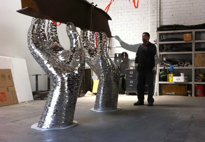 heath satow’s 9/11 memorial sculpture consists of nearly 3,000 stainless steel dove / angels welded together that form a pair of hands, which hold up part of an i-beam from one of the world trade center towers.