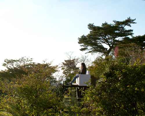 sitting on top of a grassy hill in mount rokko, japan, five white sofas appear to be floating in the air. the ‘garden sky’ project by japanese hidemi nishida studio is an environmental installation and part of the annual art festival ‘rokko meets art 2013’. the natural amphitheater shape of the landscape provides a theatrical position from which to view the beauty of the natural surroundings. easily visible from the bottom of the hill, a gradual walk up to the top finds a series of randomly jotted sofas sitting amongst the trees. each of the outdoor furniture pieces have ladders or stairs attached in order for one to reach the ‘sky’ seat. the forms are angled to enhance the experience of sitting in the sky, and positioned from a high vantage point, the festival goers interact in a playful way with both the environment and each other.