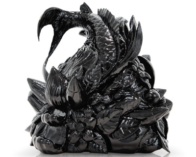 contemporary japanese artist hiroshige fukuhara‘s craftsmanship and cultural influence is evident in his series of sculptures and drawings. the hand-carved teakwood statues, coated in black gesso and resin, fuse classic japanese elements with a modern approach — in one, a horse becomes tangled in leaves, and in another a koi fish is camouflaged beneath an abundant array of flora. the glossy pieces contrast his drawings, which employ very simple media, pencil and canvas.