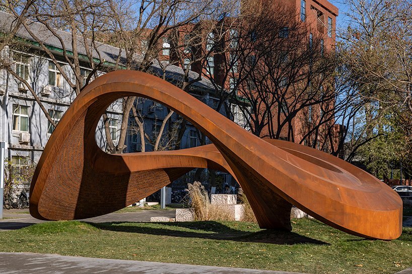 the installation is welded from 5mm-thick weathering steel. this material was selected to echo the dark-red tone of the terracotta brick exteriors of the main buildings, so as to build a connection between the installation and its surroundings.