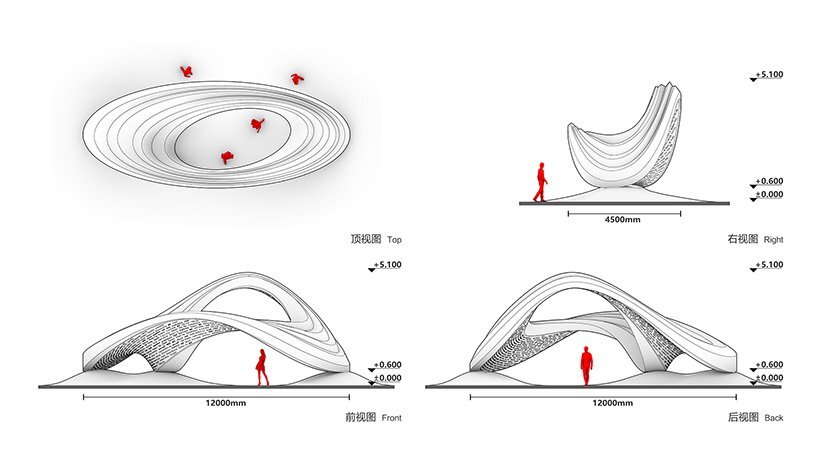 after determining the form of the artwork based on the analysis and optimization of site conditions, the next step was to figure out the specific form and spatial volume. in accordance with the intention of the work—to embody BFSU’s spirit of communication, exchange and connection—and with consideration into the site, the team eventually decided to take oval shape as the spatial prototype.