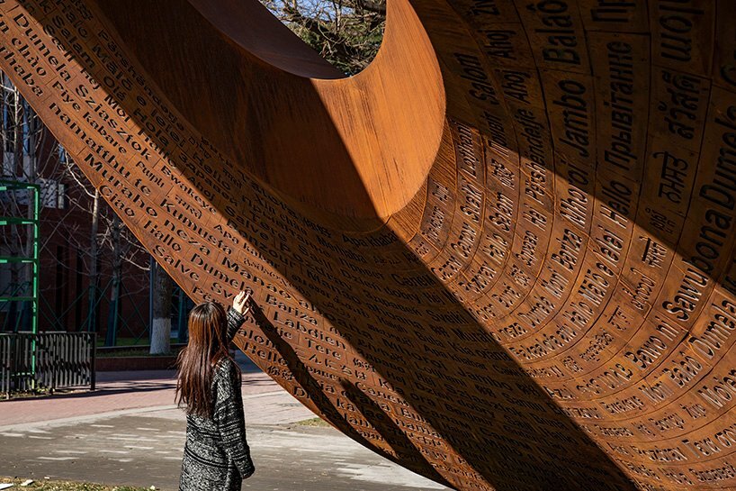 to further enhance the work, the inner surface is engraved with ‘hello’ in 101 different languages, reflecting the university’s 101 language teaching programs and expressing its warm greetings to the world.